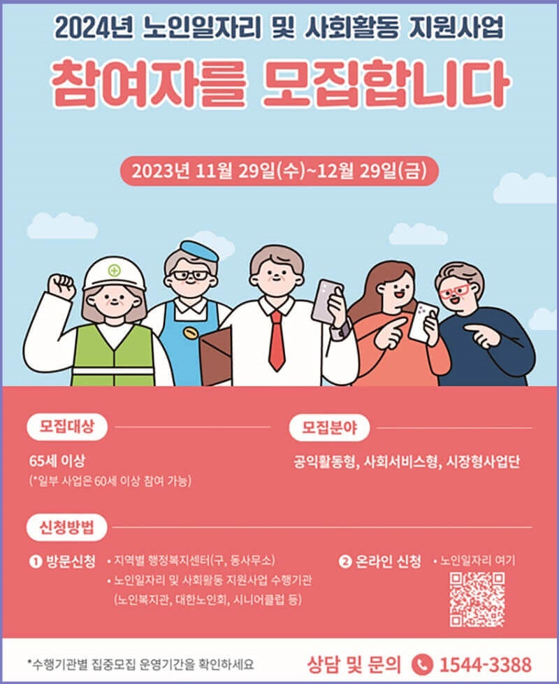 정부에서 2024년 노인일자리를 위해 12월부터 최대 확대 모집을 하고 있습니다. 고령화 시대를 맞아 어르신들의 노후준비를 위해 생활비 지원(60세 이상)에 도움이 될 것입니다. 예산을 역대 최대한으로 확대하였으니, 지금부터 신청방법과 일자리 유형에 대해 자세히 알려드리겠습니다. 기회 놓치지 마시고, 신청하셔서 희망차며 행복하시기 바라겠습니다.